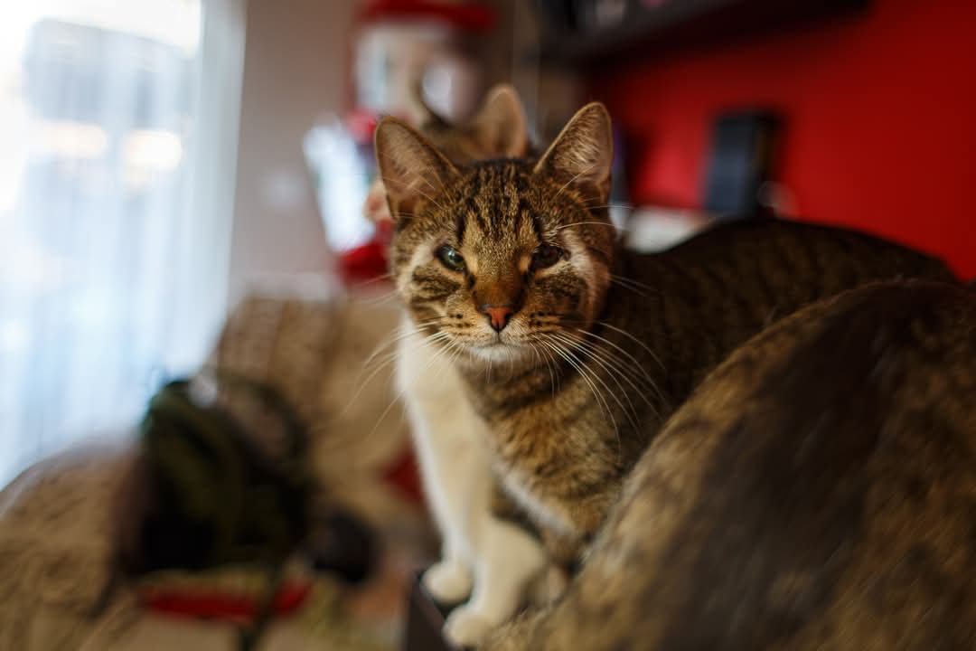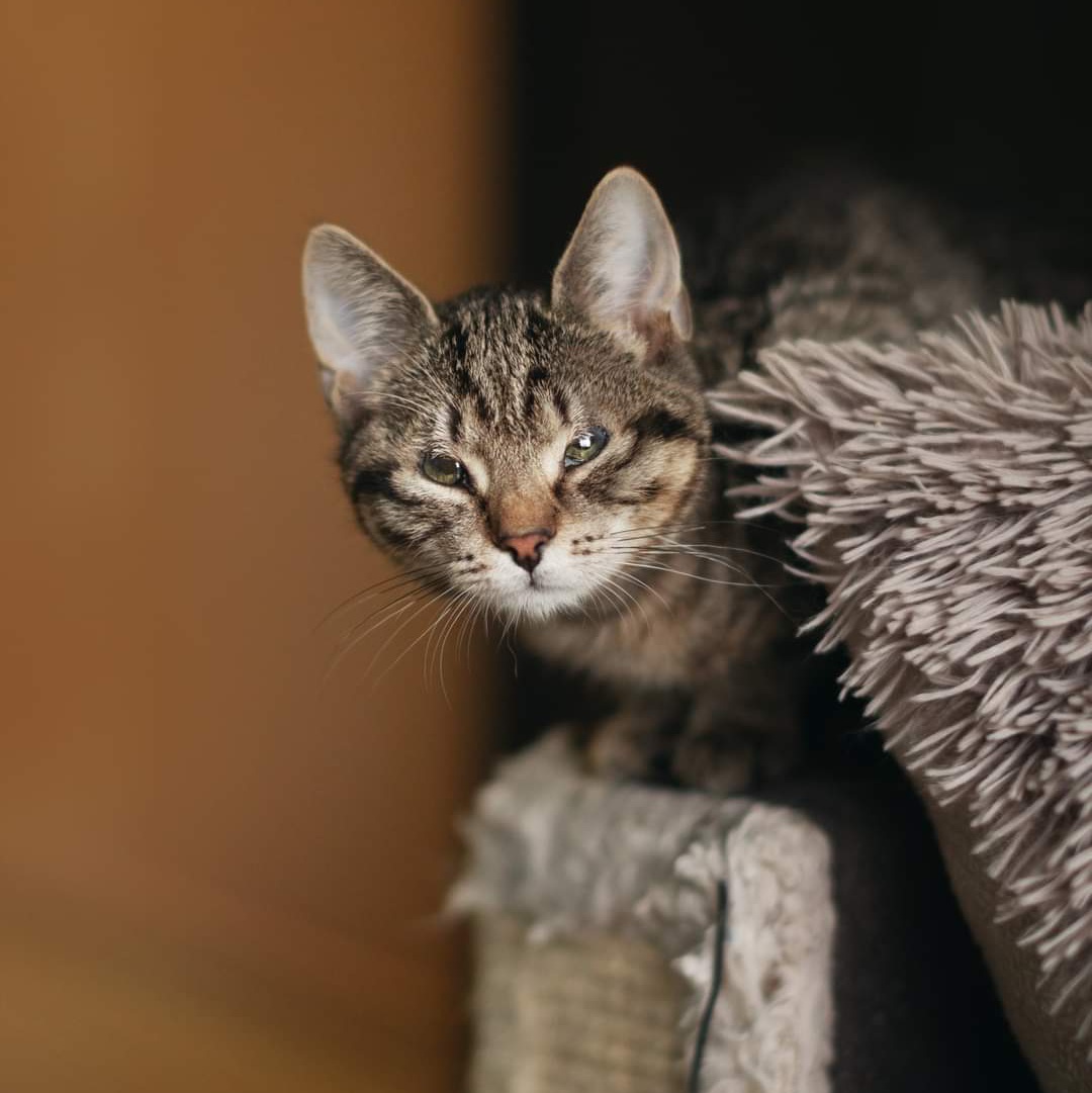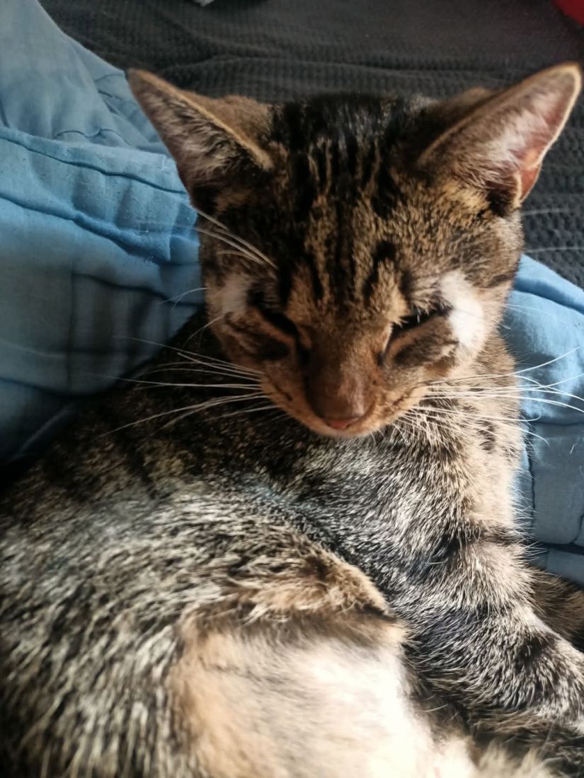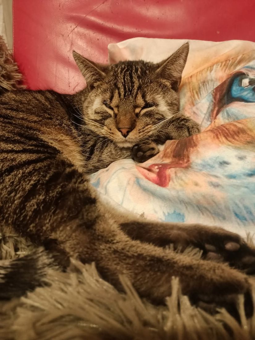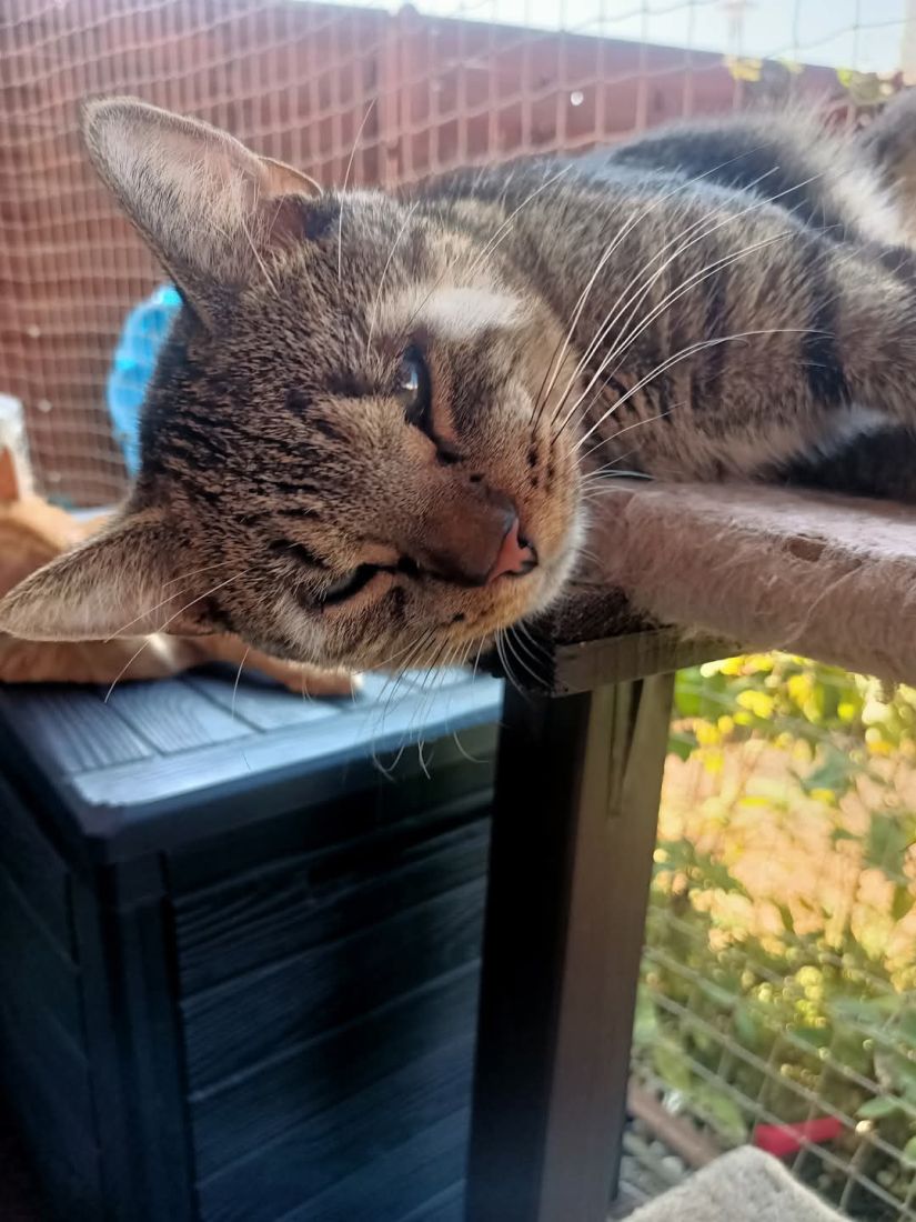 Na drapaku ma swój ulubiony hamaczek, opatentował własny styl wspinaczkowy, żeby się do niego dostać ;) Bo to niezły spryciarz i bardzo dzielny kociak. Trafił do domu tymczasowego z siostrzyczką, oboje urodzili się z niedorozwojem powiek górnych i entropium (czyli powieką podwiniętą tak, że drażni oko). Kabu miał problemy z przybieraniem na wadze, więc zabiegi trzeba było rozłożyć w czasie. Heroicznie znosił długie tygodnie przyjmowania kropelek i chodzenia w tym okropnym kołnierzu 🥹 Opłaciło się, bo oczka już nie bolą i można cieszyć się życiem. No ale do tego potrzebne jest dobre towarzystwo. Kabu kocha towarzystwo!