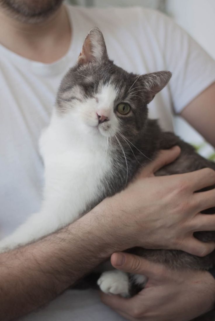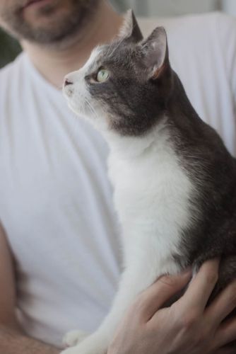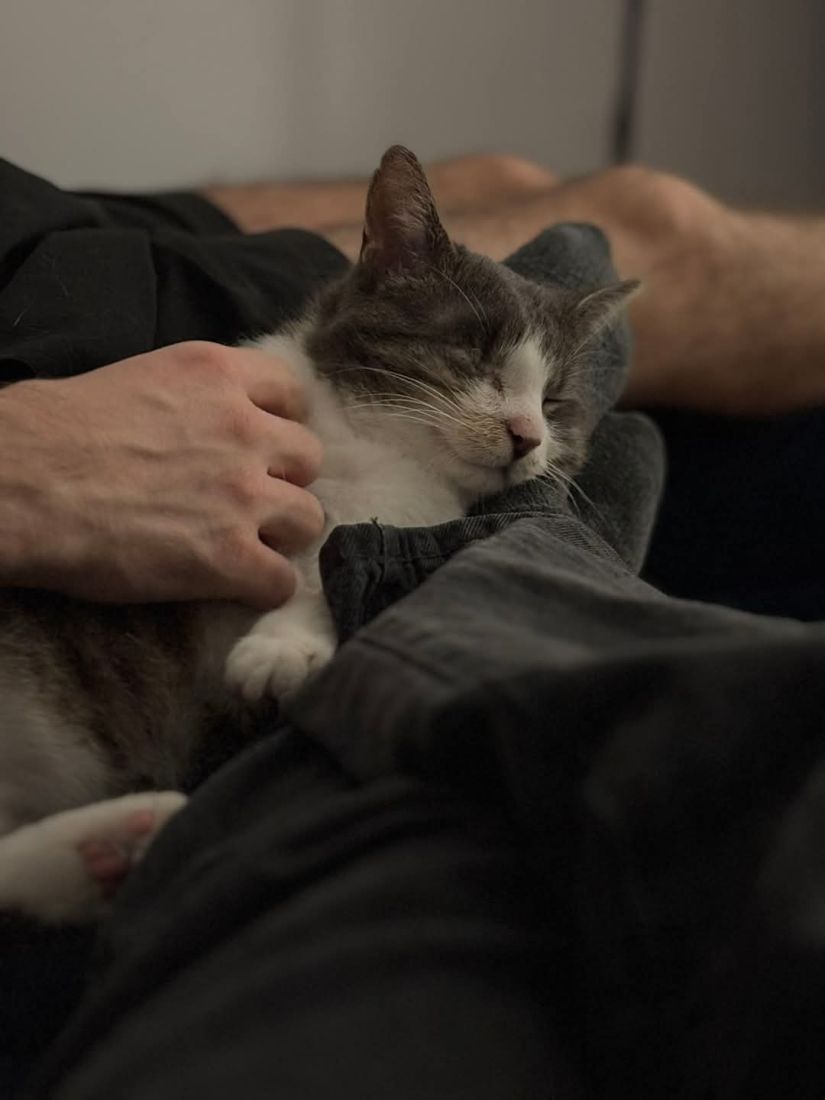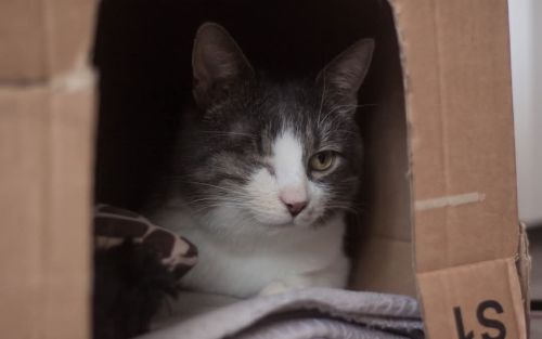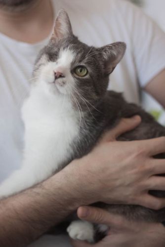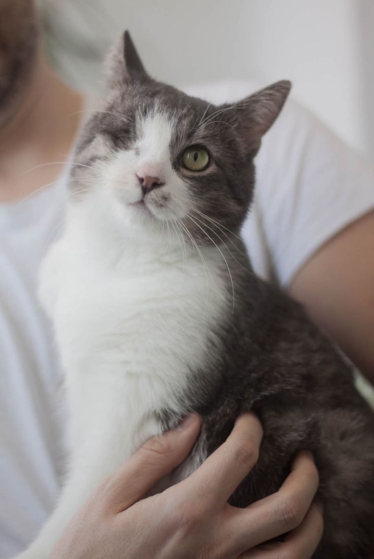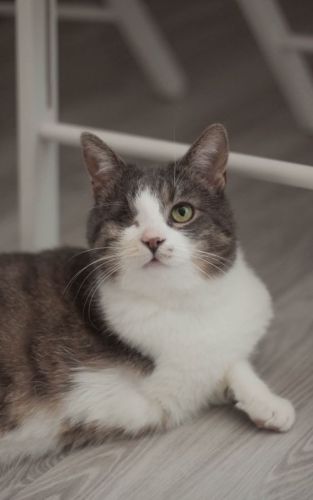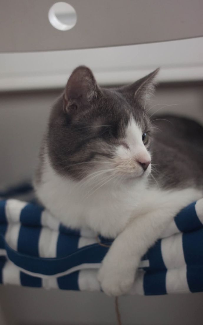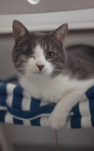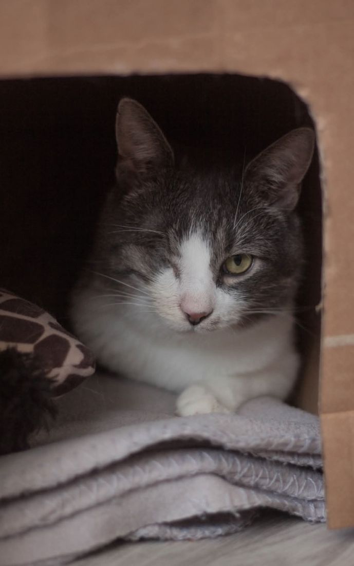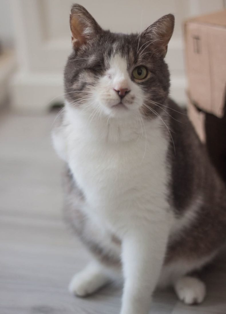 Kopytko trafił do nas po tym, jak został przygarnięty przez weterynarza po amputacji łapki. Choć weterynarz chciał pomóc, okazało się, że Kopytko nie jest w stanie dogadać się z kocim rezydentem, co źle wpływało na obu kocich gentlemanów. Dodatkowo Kopytko miał mocno zmienione, niewidzące oczko. Nie mogliśmy nie pomóc kotu, na którego nikt więcej już nie czekał, a który pilnie potrzebował bezpiecznego miejsca, gdzie mógłby spokojnie przechodzić rekonwalescencję po tak poważnej operacji. Wtedy zdarzył się cud – zgłosił się do nas dom tymczasowy gotowy przyjąć kota na jedynaka!