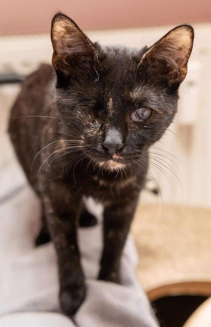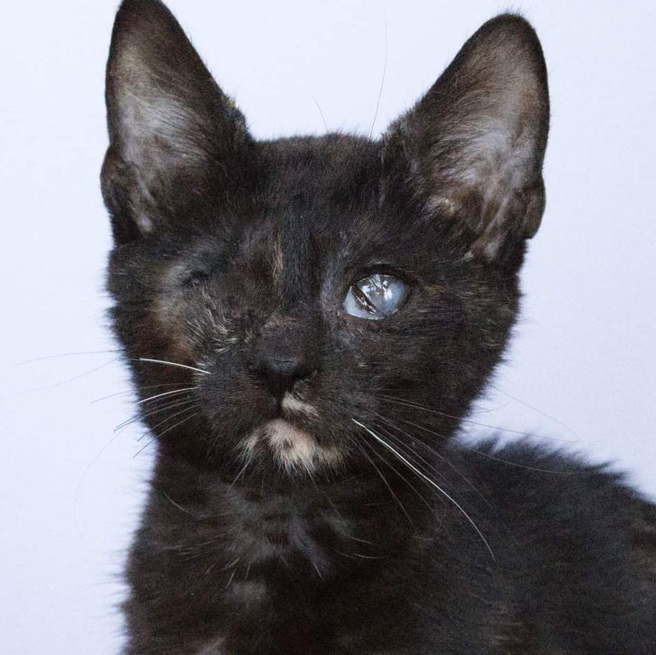 Kozieradka jest jednym z dziewięciu kociąt, które udało się nam uratować z katastrofalnej sytuacji. Dzięki szybkiej interwencji koteńka, choć trafiła do nas schorowana, z posklejanymi od ropy powiekami, zupełnie bez sił, jest teraz radosną i szczęśliwą kocicą! Choć nie udało się uratować jej wzroku, zyskała to, co najcenniejsze - życie.