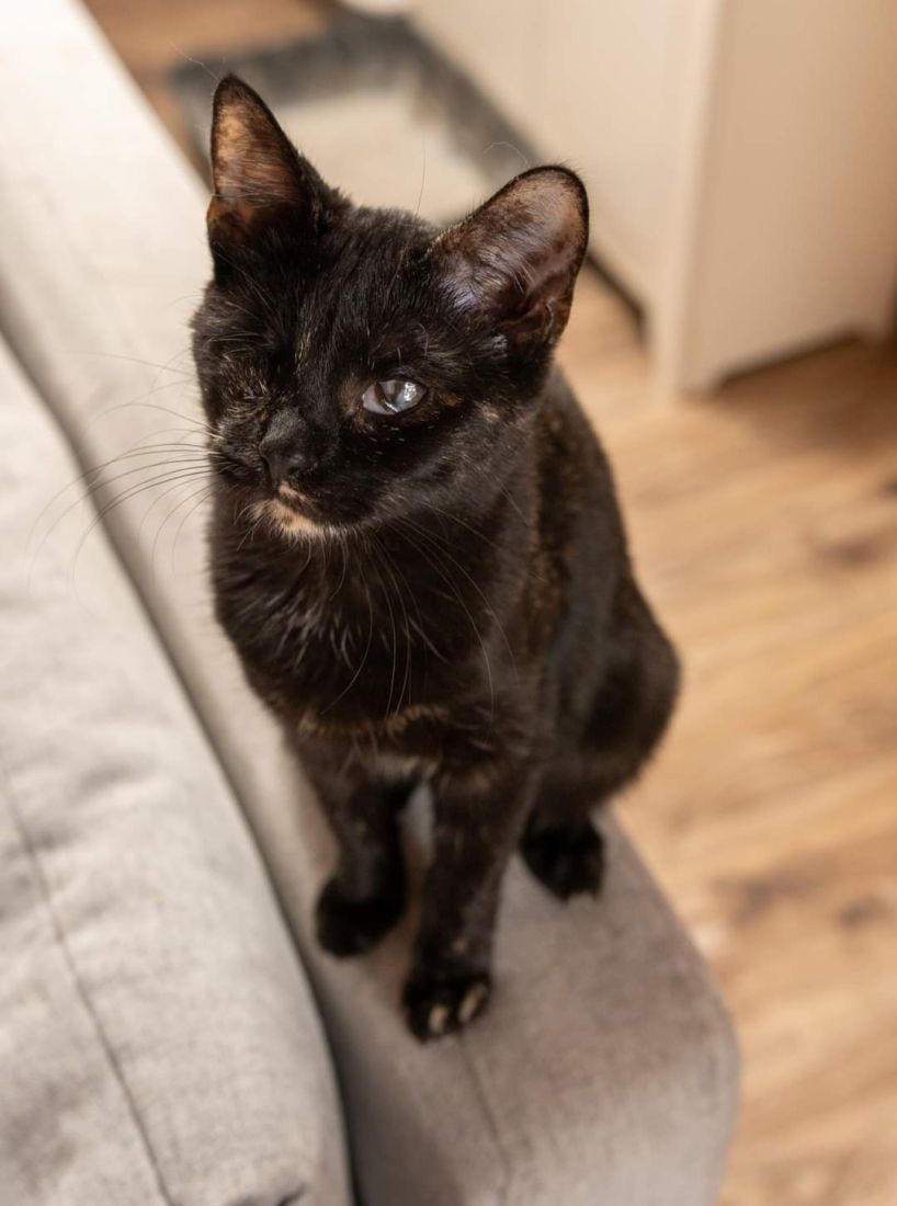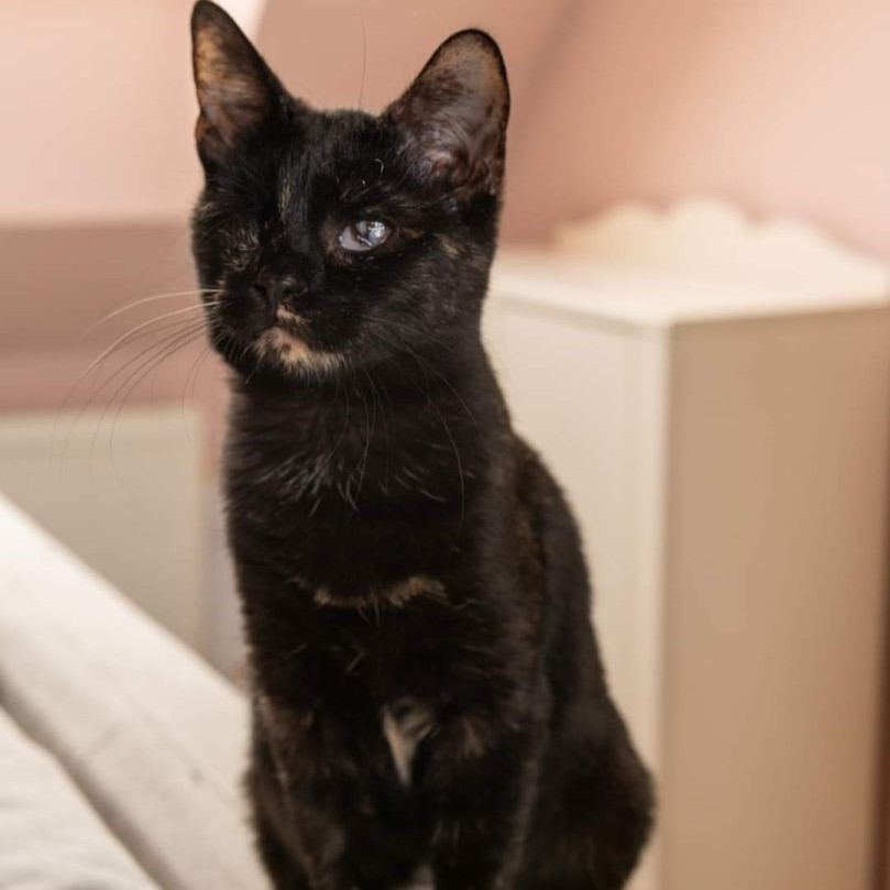 Kozieradka urodziła się w maju 2023. Jest zaszczepiona, zaczipowana, testy FELV ujemne, FIV +. Jest prawie zupełnie niewidoma, dlatego też polega całkowicie na pozostałych zmysłach, potrafi odnaleźć się bez problemu w mieszkaniu. Szukamy dla niej domu „niewychodzącego” z zabezpieczonymi oknami/balkonem.