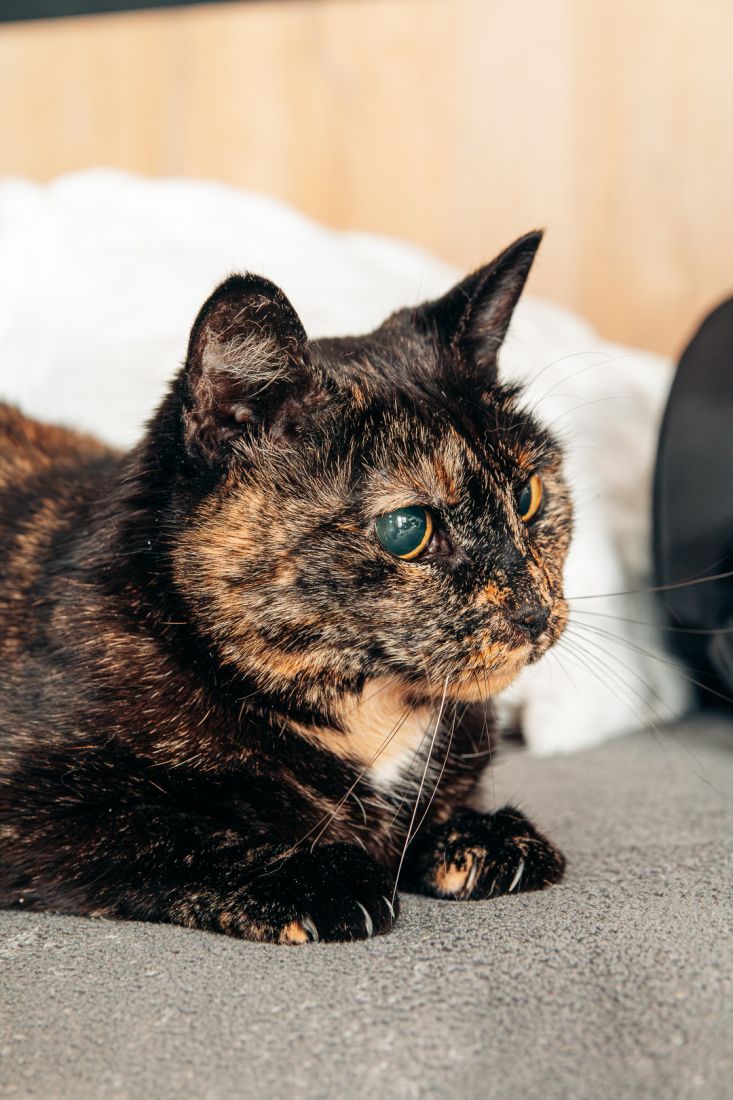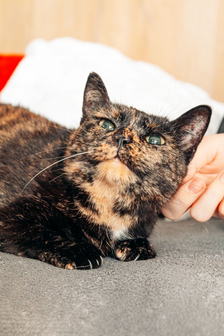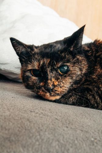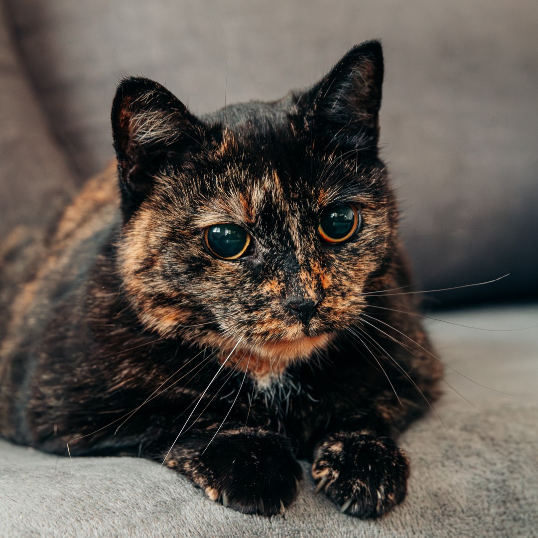 Lulu urodziła się w roku 2020. Jest zdrowa, zaszczepiona, wykastrowana, testy FIV/FeLV ma ujemne, ma chip. Nie widzi, a jej źrenice są permanentnie rozszerzone i wyglądają jak u kota ze Shreka.